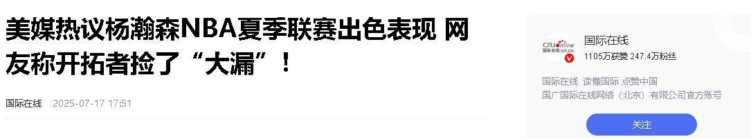 信源:新华社新媒体 2025 07 18 NBA夏季联赛|开拓者大胜火箭 杨瀚森发挥稳定国际在线 2025 07 17 美媒热议杨瀚森NBA夏季联赛出色表现 网友称开拓者捡了“大漏”!